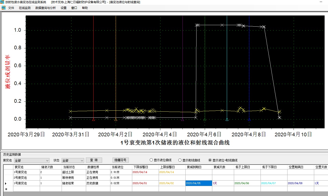 監(jiān)測(cè)軟件自動(dòng)計(jì)算衰變池從開始注液到排放結(jié)束的七個(gè)不同時(shí)期深入,并分別給出警示